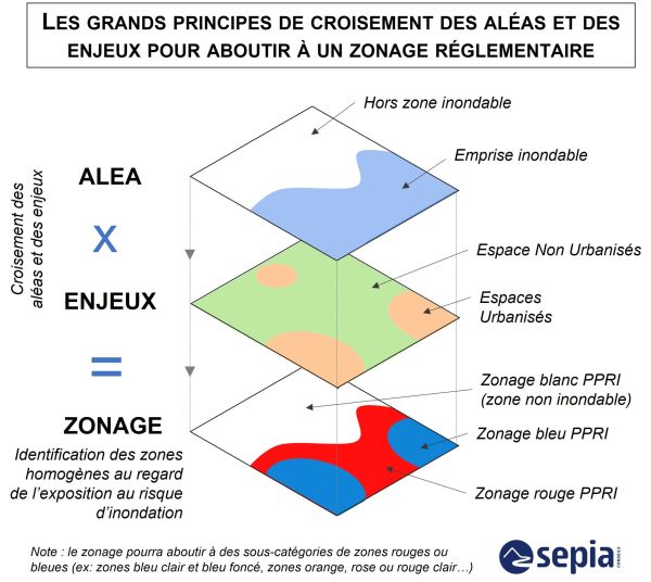 Le zonage réglementaire s’affiche sous forme d’une cartographie représentant des zones homogènes en matière d’exposition au risque sur le territoire. Il est le résultat du croisement entre l’aléa et les enjeux. Il permet de distinguer différentes zones auxquelles sont associées des règles spécifiques en matière d’aménagement du territoire (voir règlement). On distingue typiquement des :